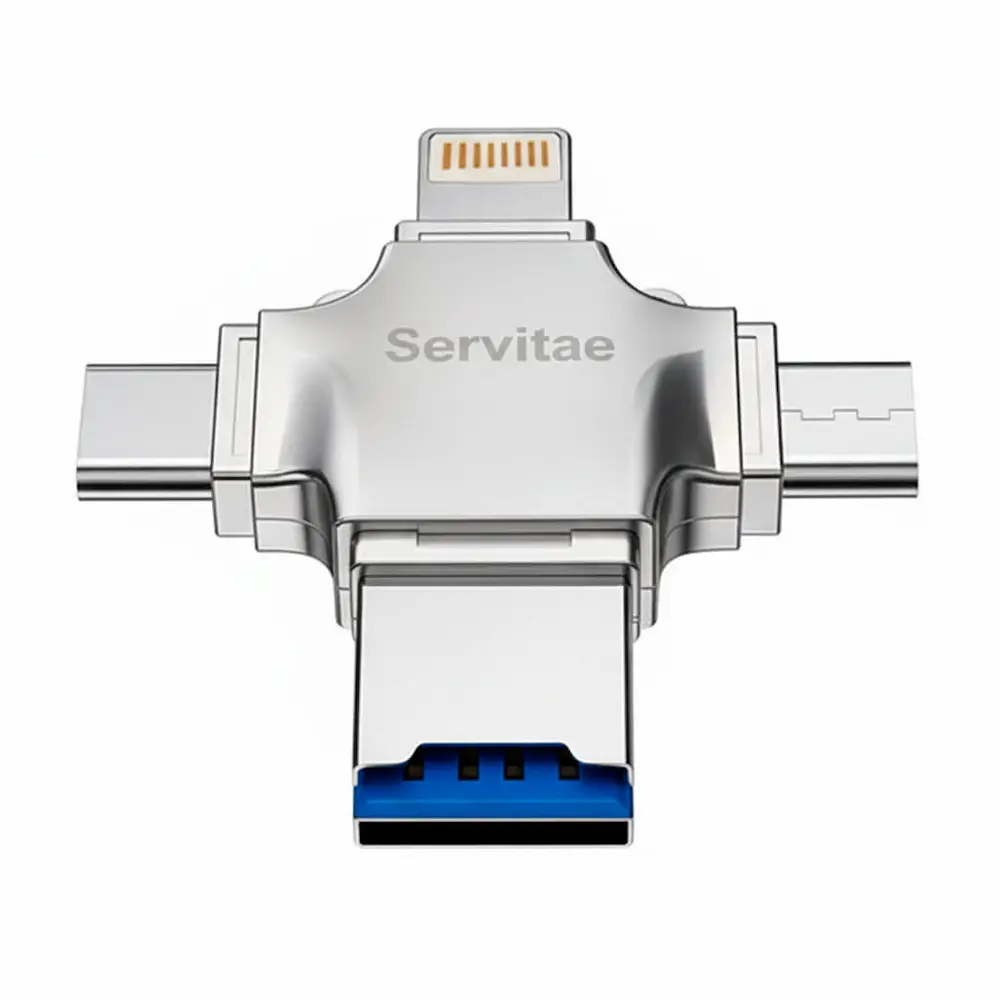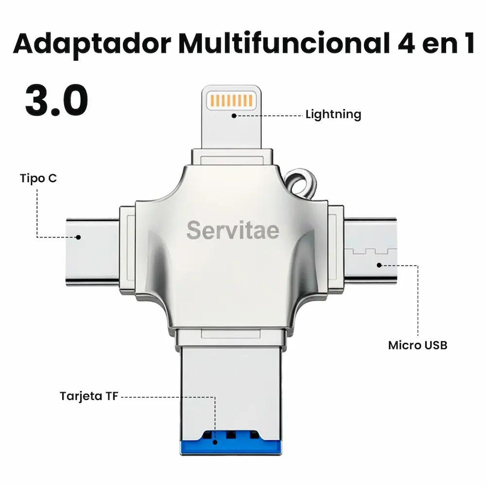 Lector OTG 4en1 Servitae – 4 conexiones en 1 (USB 3.0, USB-C, Lightning, MicroUSB) con velocidad de hasta 5120 MB/s. Diseño compacto de 4.5×4.5×2.6 cm, compatible con Android, iOS, Windows y macOS. Perfecto para transferir archivos entre todos tus dispositivos.